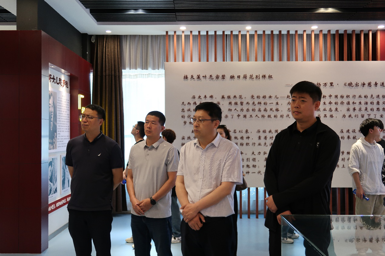 在梦桃纪念馆讲解员的引导下,大家依次参观了展馆“光辉历程 纺织骄傲”、“历史丰碑 劳模典范”、“爱岗敬业 言传身教”、“巾帼标杆 英明永存”四个部分内容。一系列照片、学习笔记、获奖证书、奖章展台生动呈现了新中国纺织行业先进模范代表赵梦桃平凡而伟大的一生。大家驻足在赵梦桃学习马列主义的书本和笔记旁,看着赵梦桃在重病期间坚持工作、照顾病友的照片,望着纪念馆的墙上赵梦桃的这样一句话:“我能动就要干,我做的离党的要求还很远。”纷纷陷入了沉思。