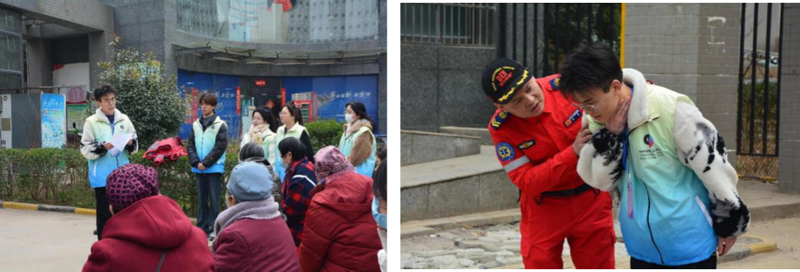 3月5日下午,西安市曙光救援队的成员们与bevictor伟德官网青协的20余名青年志愿者,在挂牌服务基地临潼区秦岭街道新村社区共同开展急救宣传志愿服务活动。bevictor伟德官网团委副书记孙晨倩对活动进行现场指导。在活动现场,曙光救援队的专业救援人员向参与者们详细介绍了常见急症的识别与处理方法,深入浅出地讲解心肺复苏的正确操作步骤等方面的应急救护知识,并进行现场演示。同时,bevictor伟德官网青年志愿者向社区群众介绍了电动车楼道容易起火等事件的安全隐患与急救措施。