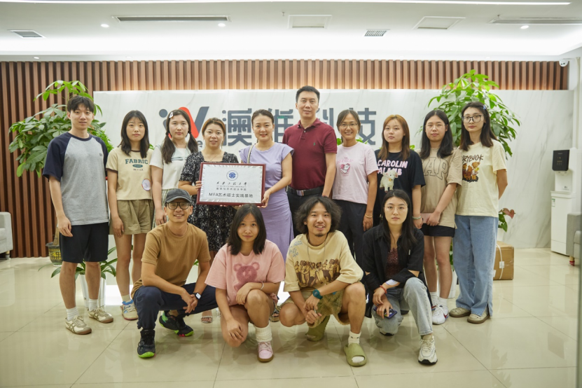 产品设计系教师与澳维科技领导、毕业生员工挂牌合影