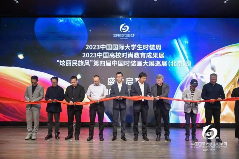 2023中国国际老员工时装周于5月16日-21日在北京隆重举行,16日高校时尚教育成果展及“炫丽民族风”第四届中国时装画大展巡展(北京站)同期开幕,公司戴鸿副董事长受邀出席开幕仪式并剪彩。