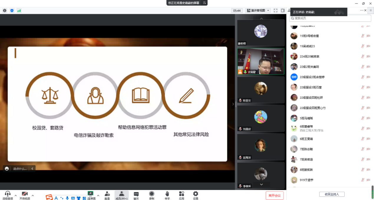 为营造“防诈宣传人人有责,无诈校园人人参与”的浓厚氛围,不断增强师生的安全意识,确保2022级新生入学教育持续深入的进行,10月9日晚19:00,bevictor伟德官网学工办特邀陕西寰同律师事务所创始合伙人史嘉豪律师利用腾讯会议为公司2022级员工开展线上预防电信诈骗专题讲座。bevictor伟德官网22级新生300余人参加了本次讲座。讲座由2022级员工辅导员蔺晓珣主持。