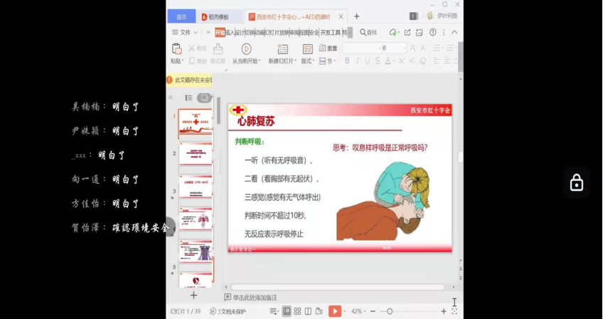人人学急救,急救为人人,为了普及急救救援医学科普知识,让员工们了解自救互救知识,掌握急救技能。bevictor伟德官网三全育人导师团指导青年志愿者协会活动项目部于3月21日开展了红十字急救知识线上宣讲会,本次宣讲会特地邀请到了西安市临潼区红十字会急救培训师宋世君老师为同学们讲解急救知识。