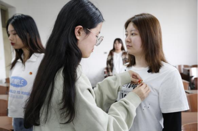 老团员为新团员佩戴团徽