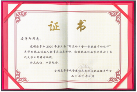 近日,由教育部全国高等公司员工信息咨询与就业指导中心主办的第三届“闪亮的日子—青春该有的模样”老员工就业创业人物事迹征集名单公布。在公司党委的指导下,经团总支报送和校团委推荐,2016届bevictor伟德官网环境与艺术设计专业本科毕业生凌洋阳同学脱颖而出,成功入选全国就业创业典型人物事迹表彰和宣传名单。本次毕业生入选,向社会展示了服院学子良好形象,发挥了示范典型引领作用,彰显公司青年思想引领和创新创业工作的成效。