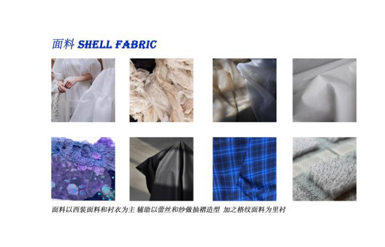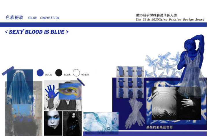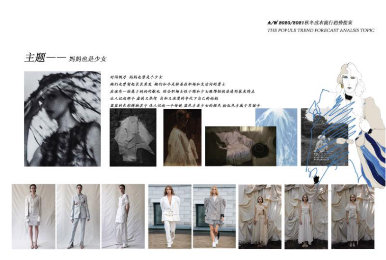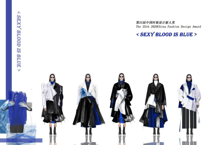 如果时间倒序,妈妈也曾是个少女,她们也曾留起长长的秀发,如今她们是拼杀在职场和生活之间的勇士,应该有一份属于妈妈的献礼。结合职场女性干练优雅和少女服饰轻快浪漫的装饰特点,让人们记起那个平淡又热情,自由又浪漫年代下自己的妈妈。《性感的血是蓝色的》整个系列服装面料使用织锦提花和羊毛面料进行服装制作,使其呈现出丰富的层次,蓝蓝的色彩辉映其中,让人记起一个传说,蓝色是少女的颜色,粉红色才属于男孩子。