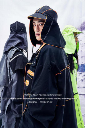 《飞天计划》主题设计灵感来源于从古至今人类对于飞天的畅想,《妖猫传》中杨贵妃荡秋千一个镜头感受到飞天的自由以及大唐的盛世,于是我想要将传统的飞天想法和未来创新碰撞,最终落脚到了目前最新的极限运动“翼装飞行”,这种服装像鸟儿一般有一双巨大的翅膀,可以让人从高空滑翔,感受到飞天的魅力。将对飞天变为现实,融合现代设计理念,将设计与市场结合,进行以年轻新风尚穿着为轴心展开设计。