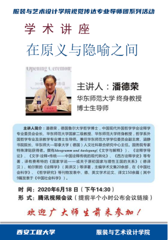 为有效提升公司视觉传达专业员工的思想文化品味,提升该专业员工的内涵建设,bevictor伟德官网视觉传达专业合力育人导师团积极组织本专业员工于6月18日14:30开展线上学习,聆听了华东师范大学终身教授、博士生导师潘德荣网络线上学术讲座《在原义与隐喻之间》,视觉传达专业约80余名同学观看了讲座直播。
