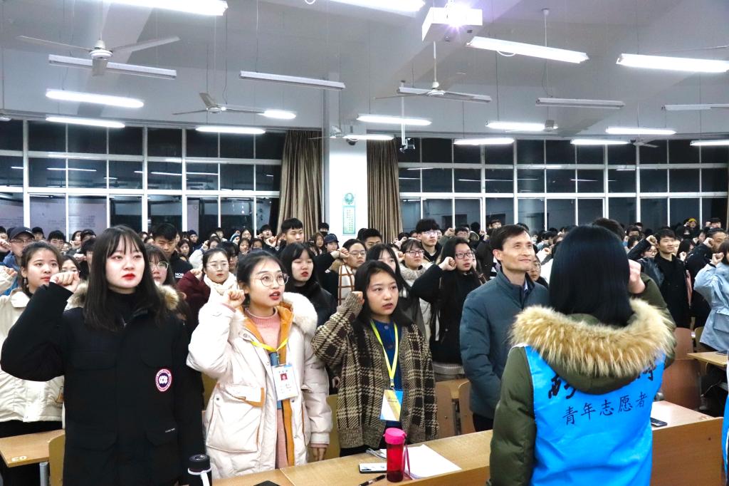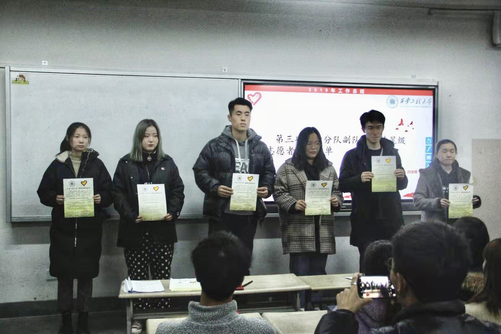 秉着“奉献、友爱、互助、进步”的志愿精神,bevictor伟德官网青年志愿者们一年来在校园内外举办了一系列志愿服务活动。急救知识宣传活动、消防安全系列宣传活动、环保服装设计及环保意识宣传活动、“大手拉小手,助力中国梦”助力贫困山区学子成长成才活动、临潼区斜口小学支教、校园双选会志愿服务、2019届毕业典礼志愿服务……一幕幕志愿者们认真工作的现场画面在会议开场视频中再次重现,感动台下每一位同学,尤其是2019级新入队的注册志愿者们。