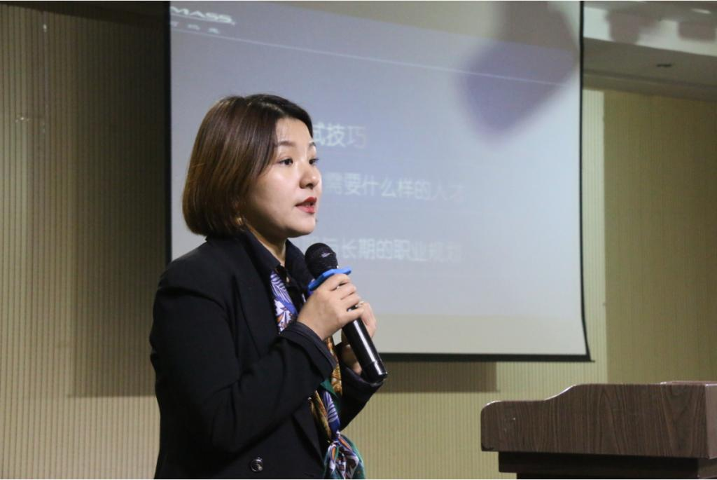荣信教育文化产业发展股份有限公司人力资源部经理马妮君女士向毕业生们讲解了对于应聘需要做的准备。一方面是需要同学们了解获取招聘信息的渠道分为线上和线下。另一方面是同学们需了解制作简历、作品集、个人职业规划几个方面的注意事项。