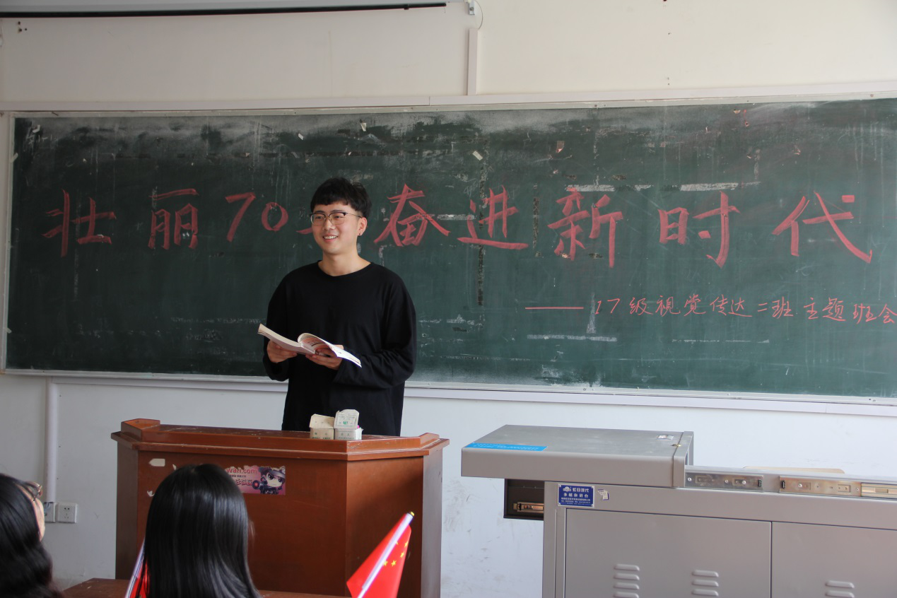 2017级视觉传达2班召开“壮丽70年,奋进新时代”主题班会,组织班级全体同学朗诵爱国诗歌、观看阅兵视频,表达爱国热情。