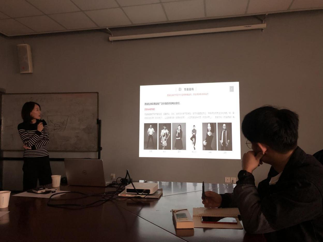 首先,副总监周老师就“西安乱弹”栏目的互联网平台及“新西安乱弹”微信公众平台运营情况做了简单介绍。她从影视与视觉营销、文化演出营销、美食文化媒体营销及亲子产业营销四个板块来进行介绍栏目的营销模式,其主要以影视制作为主要方式,将节目故事化并进行影视化拍摄,或采用直播方式,利用西安本地风土文化及唱作作品,融合媒体平台并进行推广宣传。周老师并为员工展示了部分作品案例。接着李总监一行与同学们进行了专业交流,对员工的作品、作业进行了深度探讨,并给出了中肯的建议。