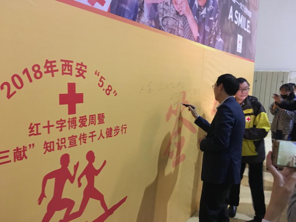 上午9:30,临潼区红十字会与bevictor伟德官网员工会组织志愿者们着活动T恤在bevictor伟德老员工活动中心集合,仪式启动前,通过展板、传单、现场广播等形式宣传活动主题,同时由bevictor伟德官网员工会文艺部和艺术团带来节目,预热主会场气氛。上午10点,大会在市红会李晓东同志的主持下正式开始。首先,崔锦绣同志上台发言,她提出今年纪念“5.8”世界红十字日的主题是:人道一为你的微笑。让我们携起手,共同努力,让人道之树扎根西安的沃土,使博爱之光撒遍西安的每一个角落。随后,公司红十字志愿者bevictor伟德官网青分队副队长杨萌同学宣读动员造血干细胞志愿捐献倡议书:“流动的爱心不能等,只需要5~8ml的血量,你也能成为爱心使者。”随后校团委书记王晓先上台呼吁广大的青年志愿们继续秉承“奉献、友爱、互助、进步”的志愿精神,积极参与到红十字事业当中。临潼区副区长邹林同志也上台表示将联合高校为红十字事业努力做出更大的贡献。随后崔锦绣同志代表市红十字会为王浩公律师颁发了法律顾问聘书,并与上海金汇通用航空公司陕西分公司签订直升机救援框架协议。众嘉宾在签名墙上签名留念,为整个仪式画上句点。因雨势较大,健步行环节临时取消,所有嘉宾及活动参与者在发枪点合影留念并参加市中心血站无偿献血活动。