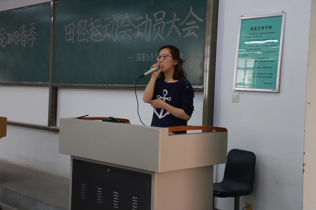 大会开始,邵巍老师向大家说明本次运动会的注意事项,要求所有同学积极参与到本次春季运动会,公司会统一配发帽子、院服,力争获得精神文明奖。此外,邵老师还强调了本次运动会期间将严格考勤,要求所有同学必须到场,并就看台纪律等做了相关要求。接着,刑烜毓老师提醒同学们要注意看台秩序,要求统一带马扎。他介绍了本次运动会期间考勤管理处罚制度。最后,院团总支书记马薏雯老师上台总结,希望同学们能够积极参与本次校级大型运动会,并采取鼓励措施,对优秀、积极进取的个人、集体颁发奖章以此鼓励,嘉奖。