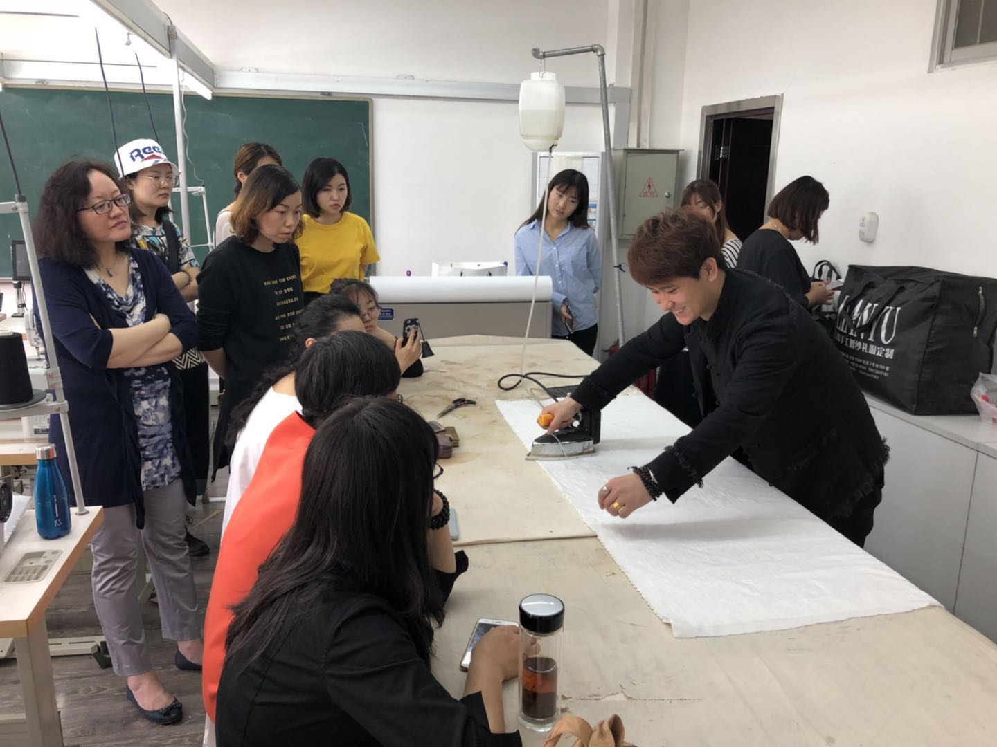第二天上午的课程主要是对面料进行处理,根据纸样裁剪出衣片;下午在主楼723教室进行《婚纱礼服流行趋势、品牌理念及发展》的专题讲座。本次讲座还邀请到GraceyHan手工坊韩老师就《法式刺绣工艺制作》进行联合讲座。在讲座中,朱老师就2017年《莲御》品牌在北京服装周上的品牌服装发布进行分享,以及品牌目前发展现状与同学们做以交流。韩老师就法式刺绣的工艺制作进行现场展示,为同学展示出自己作品并进行了详细的讲解。
