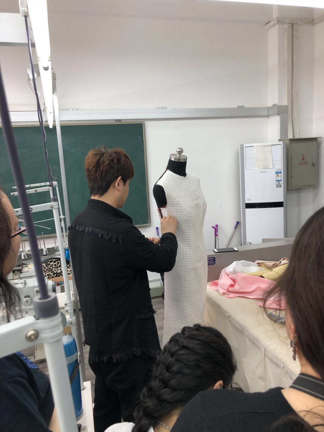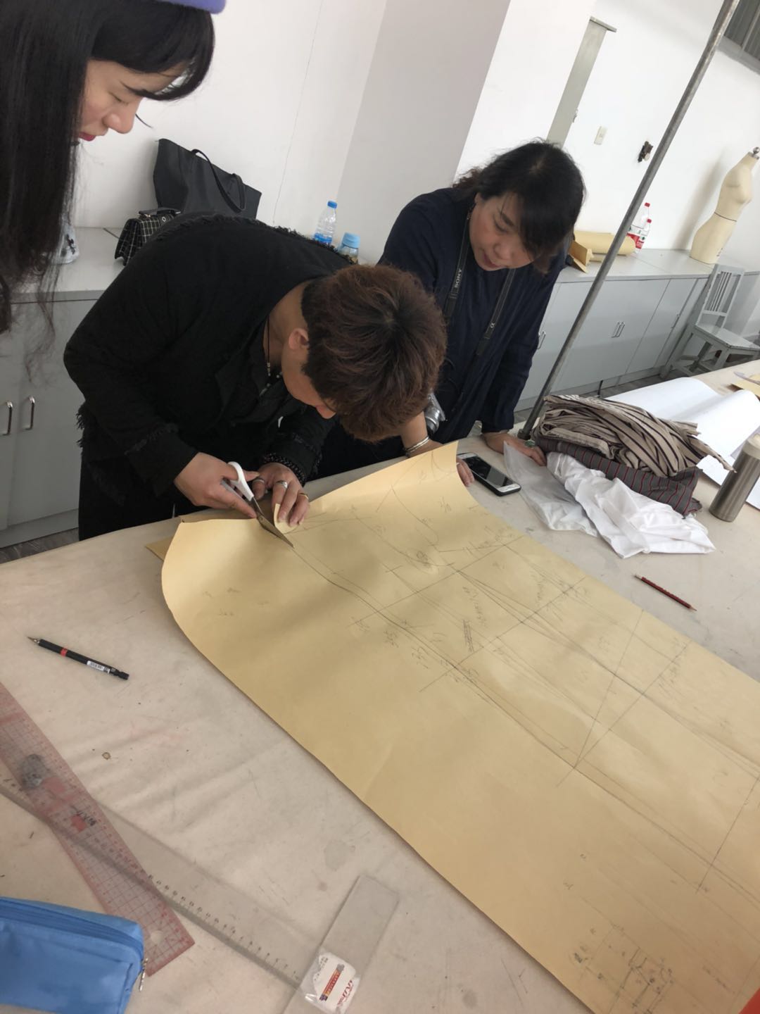 第一天交流的内容为旗袍的工艺制版,参加人为服装设计教师、服装工程系教师、内衣设计系教师。在第一天的交流中,朱昕有老师从量体入手,提出旗袍的量体要点,结合服装款式设计要求得出制版尺寸;根据尺寸进行样板绘制,在此期间各位老师也就制版内容与朱老师交流学习,制作出各自的旗袍样版。