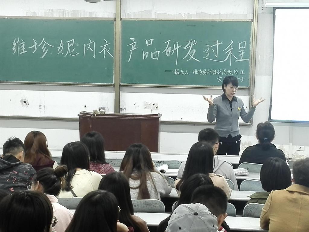 维珍妮集团研发部高级经理黄肖莲女士就维珍妮公司的内衣产品研发过程从技术角度为老师和同学们做了详细的讲解与介绍,并对讲座过程中出现的疑难点做出仔细又专业的解答,使大家对内衣产品研发过程有了更加深入的了解,增加了对内衣制作过程的相关知。