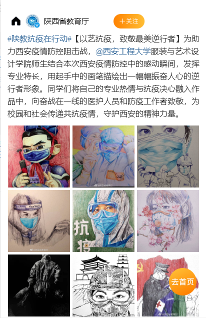 公司视觉传达系“以艺抗疫,最美逆行者”主题抗疫作品被陕西省教育厅微博客户端转载,全文如下: