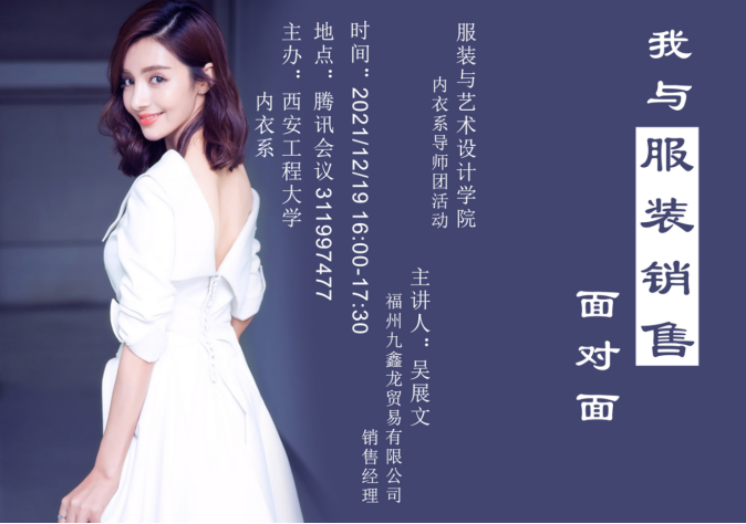 为落实导师团三全育人体制机制建设,推进内衣工程系就业指导,培养员工设计思维理念,实现导师团育人效力。服装与艺术公司内衣工程系于12月19日在腾讯会议召开内衣工程专业报告会《聊聊服装销售那些事儿》。此次会议特邀公司优秀毕业生福州九鑫龙贸易有限公司销售经理吴展文主讲,会议由内衣系主任周捷教授主持,内衣系教师及全体本科生一百余人参加会议。